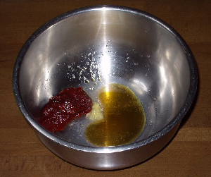 ボールに、すり下ろしたニンニク2ケ、お酒20cc、コチュジャン大さじ2杯、ごま油大さじ2杯を入れ、良くかき混ぜます。