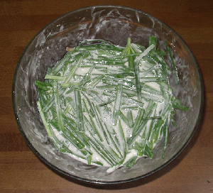 ニラ半束に対して1カップくらいで、お好み焼きよりも薄めのサラッとした感じにします。
