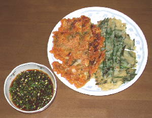 お好み焼きと違って、韓国ではチヂミは写真のように四角く切って出されています。
