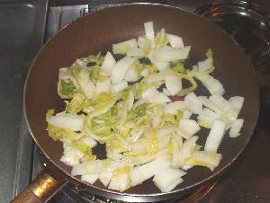 白菜を1cm位の巾に切り、よく水気を絞ります。