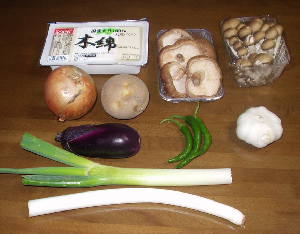 お豆腐半丁、玉ねぎ1個、ジャガイモ1個、ネギ1本、茄子やシイタケ(キノコ類)をお好みで、ニンニクと青唐辛子はお好みで入れて下さい。